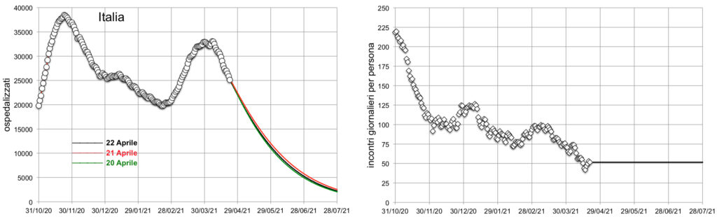 Le curve simulate sulla base dei dati degli ultimi quattro giorni si mantengono vicine le une alle altre. In queste condizioni, con una mobilità attestata su circa 470 incontri medi giornalieri per persona, il picco dell’ondata è previsto per fine anno. Si tratterà di un picco con circa 8.000 ospedalizzati. L’ondata con picco il 1° aprile ha raggiunto circa 34.000 ospedalizzati ed eravamo in zona rossa, oggi siamo in zona bianca e arriveremo a toccare neanche un quarto degli ospedalizzati del 1° aprile scorso!